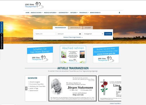 Zum Jahresende schaltet das Druck- und Pressehaus Naumann sein neues Trauerportal frei. Unter www.trauer.gnz.de finden Interessierte Anzeigen und alle Informationen zum Thema Trauer. Alle Traueranzeigen können schriftlich per E-Mail oder persönlich im Kundencenter des Druck- und Pressehauses Naumann aufgegeben werden. Hier ist man gerne bei der Gestaltung behilflich. Der neue Service ist ebenso interessant für Anbieter rund um das Thema Bestattung. Auch sie sind dank der neuen Plattform zweifach vertreten – Print und online. Trauerdienstleister haben außerdem die Möglichkeit, sich online im Branchenbuch des neuen Portals einzutragen, um von denen gefunden zu werden, die Hilfe und Rat in Trauerangelegenheiten in Anspruch nehmen möchten.